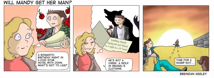 One of a series of cartoons which ran in First magazine, illustrating the “Will Mandy Get Her Man” articles.